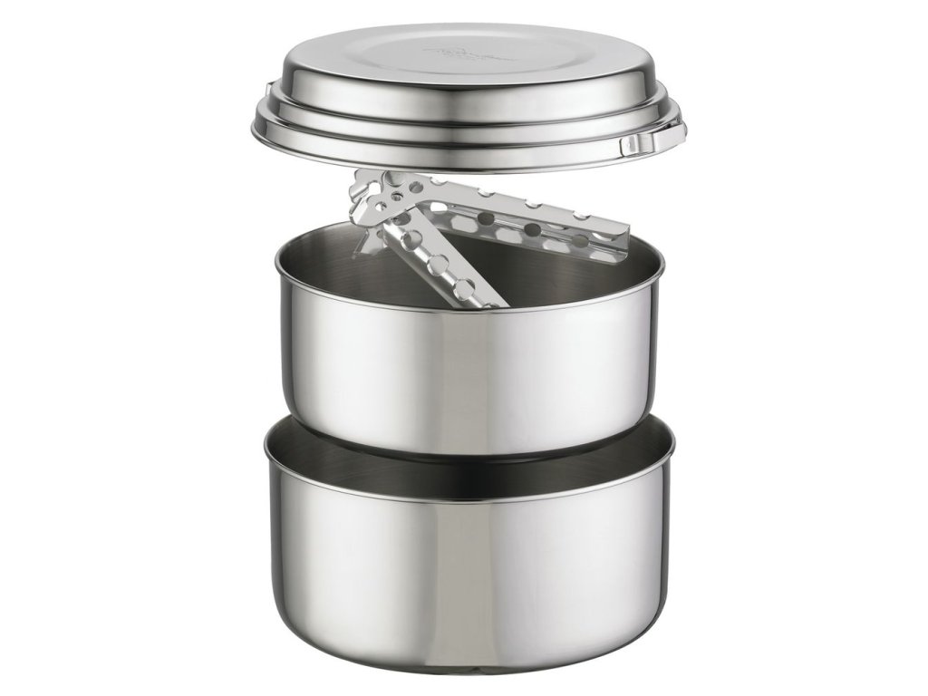 Alpine 2 Pot Set je odolná a lehká sada nádobí určená pro dvě osoby. Je vyrobena z vysoce odolné nerezové oceli, spolehlivé i v těch nejextrémnějších podmínkách. Víko padne na oba hrnce a můžeme ho použít jako talíř.