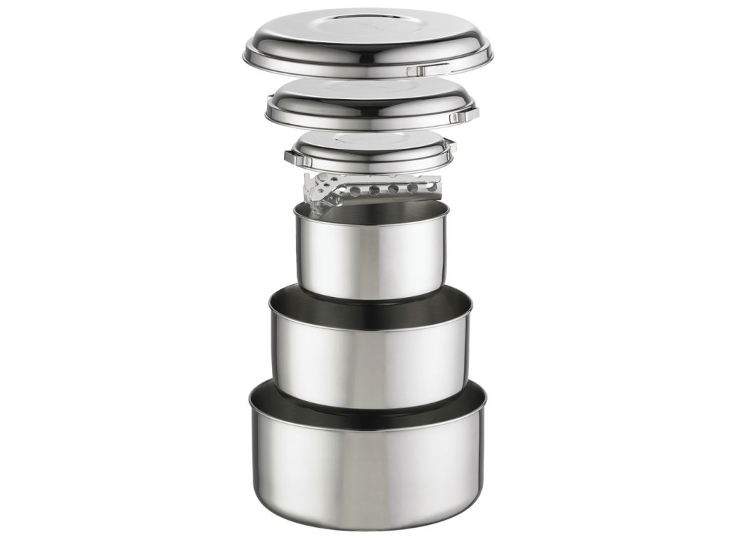 Alpine 4 souprava je vyrobena z neuvěřitelně odolné nerezové oceli, spolehlivé i v těch nejextrémnějších podmínkách. Je ideální pro náročné a časté používání. Každá nádoba má vlastní víko, které zároveň slouží jako talíř.Celou sadu lze složit do největšího hrnce.